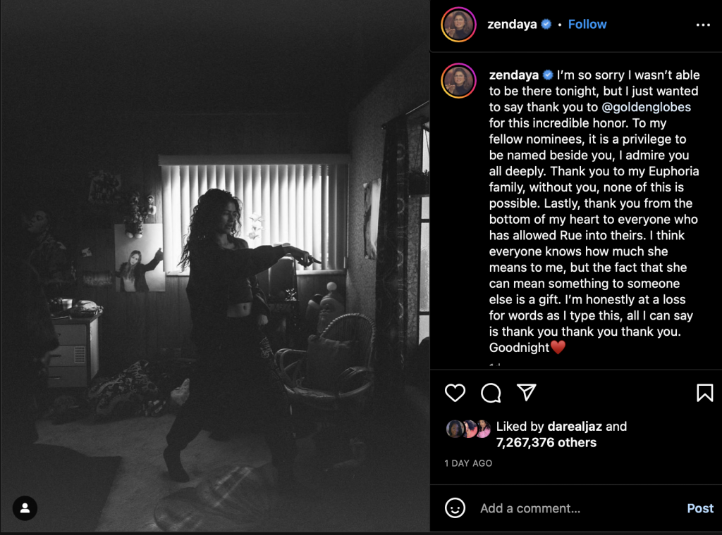 “I’m so sorry I wasn’t able to be there tonight, but I just wanted to say thank you to @goldenglobes for this incredible honor,” she began. “To my fellow nominees, it is a privilege to be named beside you. I admire you all deeply. Thank you to my ‘Euphoria’ family without you none of this is possible.”